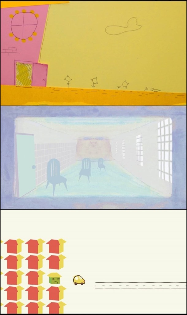 Screenshots from Lacy (WIP PC game): Backgrounds made with collage and watercolour paint. Models made in Blender.