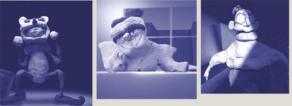 Daisy, Phillip and Doris concept art from Biggs’ Station GDD (university work): Plasticine models on 3D ProBuilder backgrounds.